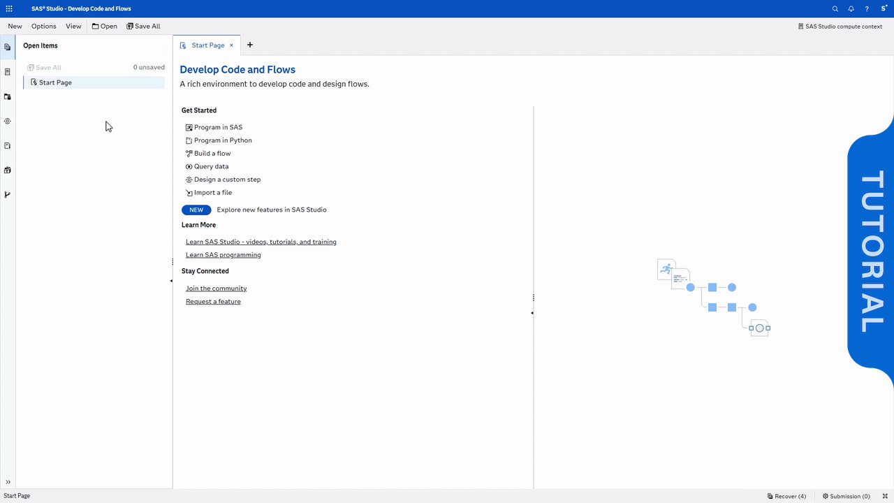 This Quick Start tutorial shows you how to develop SAS code using SAS Studio. Explore the helpful features in the SAS Studio program editor, including the DATA step debugger, code snippets, background submission, and program scheduler